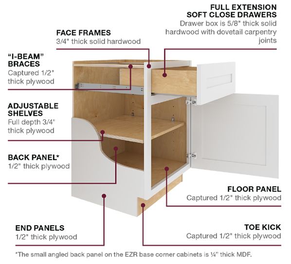 | Base Cabinet Braces | 1/2" thick CARB compliant plywood l-beams | Plastic corner gusset blocks |