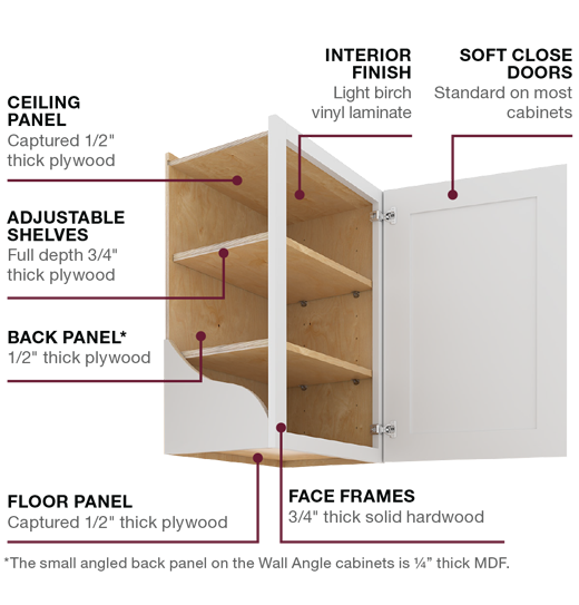 | Back Panel | 1/2" thick CARB compliant plywood, full height | 3/8" or 1/4" panel with MDF hang rails |